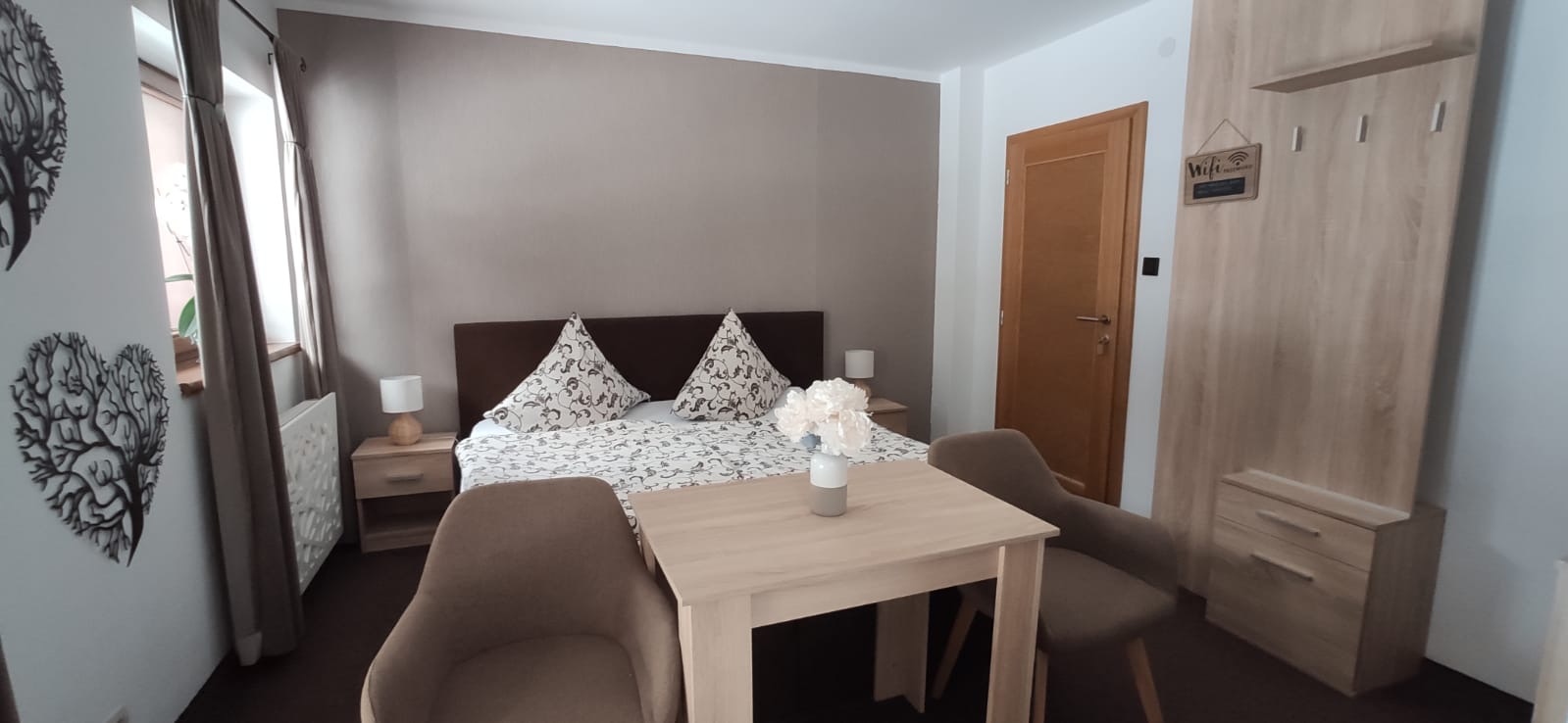 Przytulnie urządzony pokój o powierzchni 24 m2, idealny dla dwóch osób. W pokoju znajduje się łóżko małżeńskie, stół jadalny, krzesła, LCD, łazienka z prysznicem i WC, balkon oraz praktycznie wyposażona kuchnia na przygotowanie łatwych i prostych dań oraz śniadania.